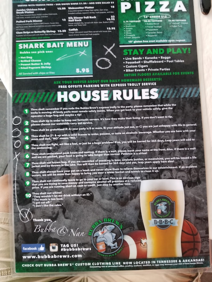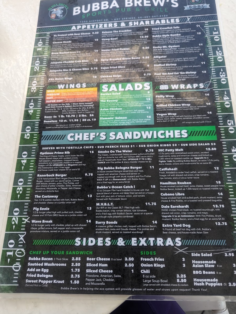Welcome to Bubba Brews - On Lake Hamilton, where delightful dining meets stunning lakeside views. Located at 1252 Airport Rd, Hot Springs, AR, this gem offers a menu bursting with flavor and freshness. Dive into their Touchdown Salads featuring the crispy Asian Chicken or the zesty Peel 'Em And Eat 'Em Shrimp. For heartier appetites, the Classic Dinners shine with options like the mouthwatering Bubba's Ocean Catch and the satisfying Pulled Pork Dinner.